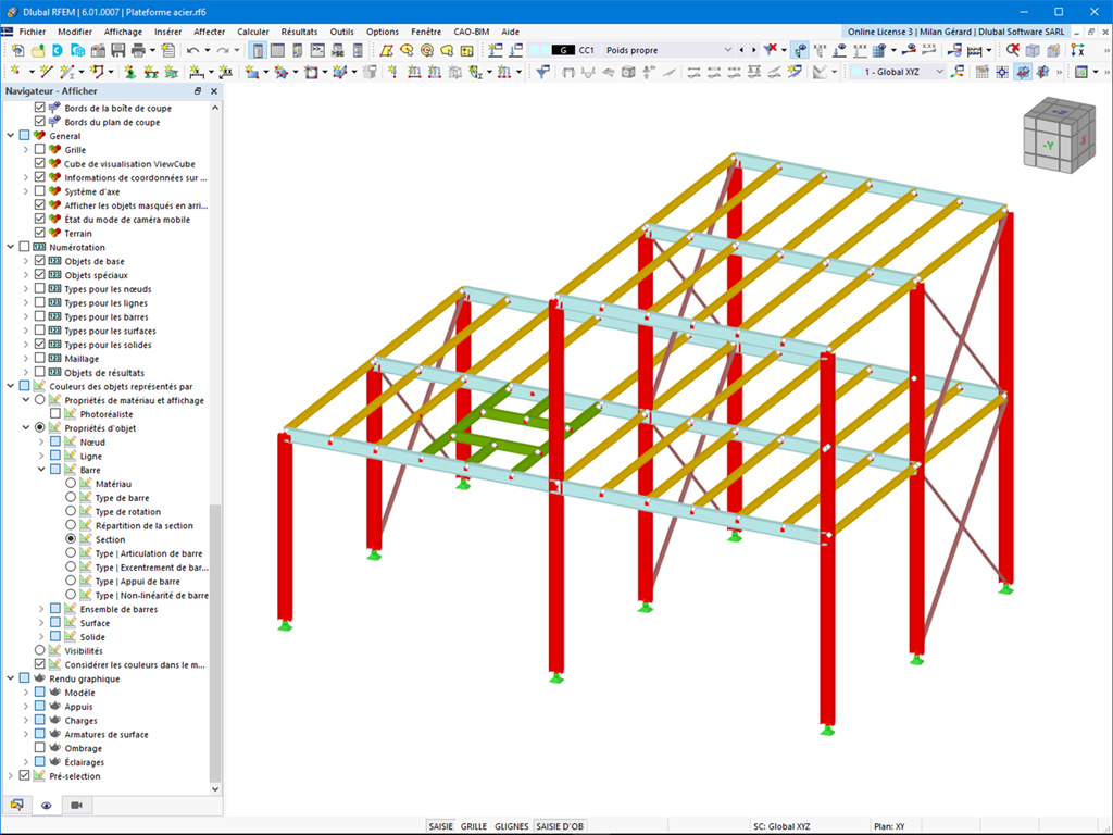 Une distinction est faite entre les différentes propriétés d'objet des nœuds, des lignes, des barres, des ensembles de barres, des surfaces et des solides. De plus, le modèle peut être affiché avec un rendu photoréaliste.