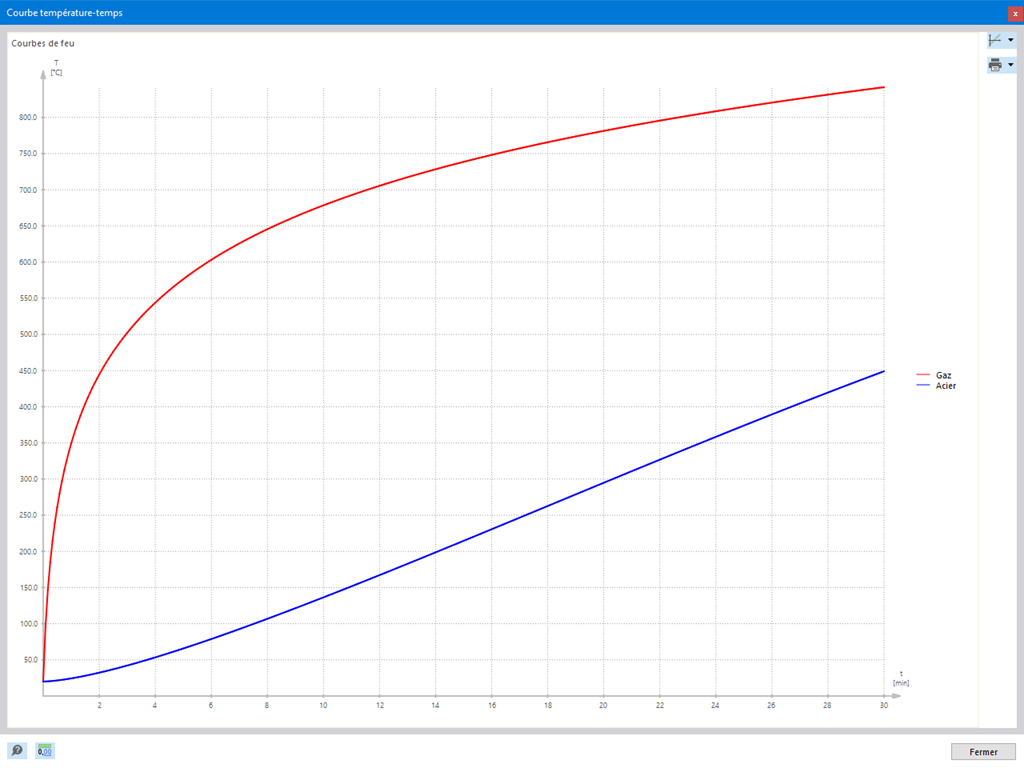 La température déterminante du composant au moment de l'analyse peut être déterminée automatiquement pour la vérification de la résistance au feu à l'aide de l'entrée. Le diagramme température-temps permet de visualiser la courbe de température en fonction du temps.