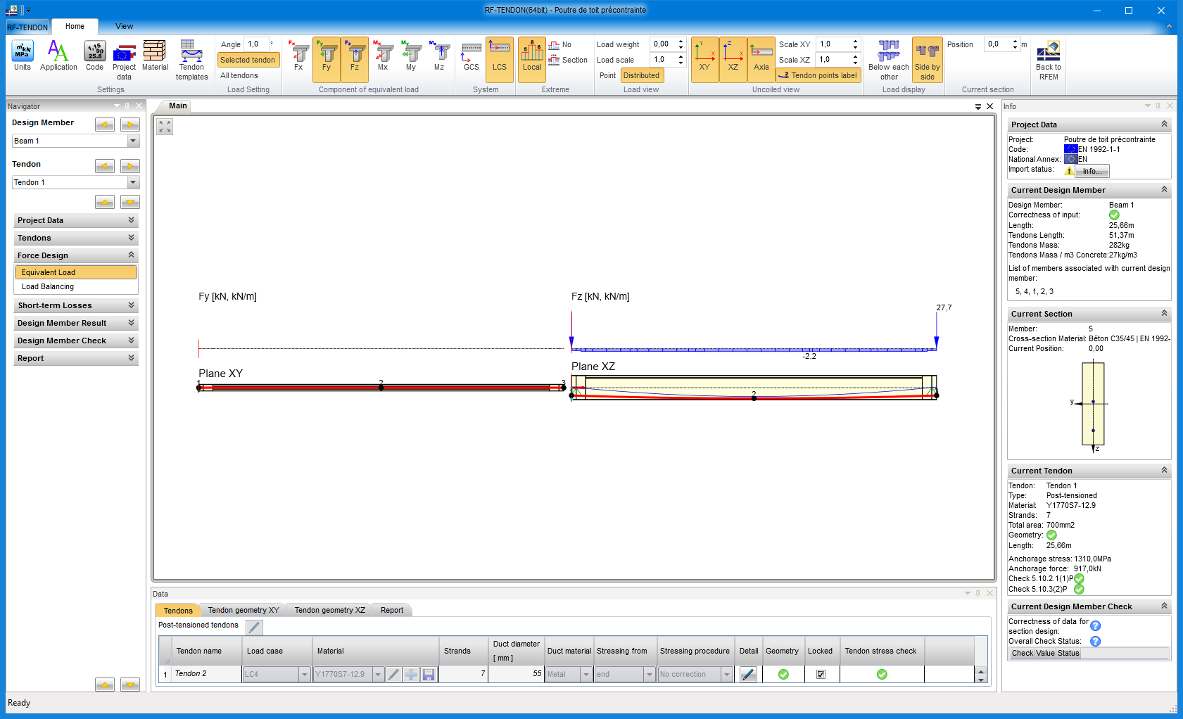 - Méthode de calcul 1 : Calcul simplifié selon 6.8.6 et 6.8.7(2) : Le calcul simplifié est appliqué pour les combinaisons d'actions fréquentes selon l'EN 1992-1-1, 6.8.6(2) et l'EN 1990, Éq.(6.15b) avec les charges de trafic appropriées à l'état limite de service. L'étendue de contrainte maximale selon 6.8.6 est vérifiée pour l'acier de béton armé. La contrainte de compression du béton est déterminée à l'aide des contraintes supérieures et inférieures admissibles selon 6.8.7(2).