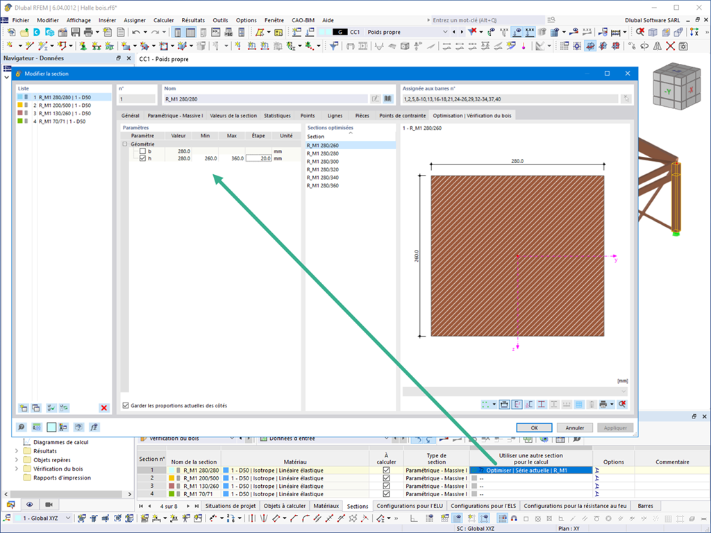 Vous pouvez optimiser les sections dans les modules complémentaires de vérification (par exemple, vérification de l'acier, vérification du bois, etc.).