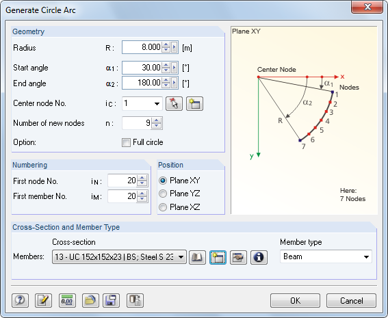 L'arc de cercle ou le cercle entier est défini par le Rayon et les Angles. L'objet est créé autour d'un point central qui peut être sélectionné en tout point des plans globaux.