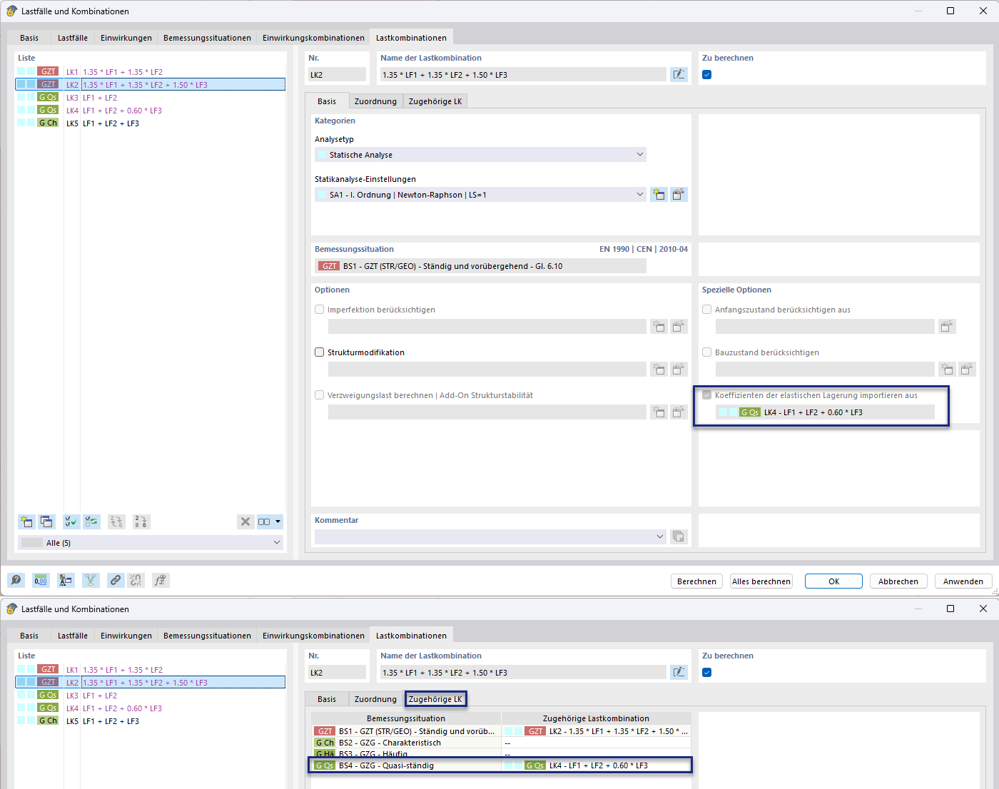 En sélectionnant l’attribution de la combinaison de charges associée, les coefficients de cette combinaison sont automatiquement importés dans les combinaisons de charges générées, comme le montre l’image suivante. Si cela n'est pas rempli chez vous, vous pouvez l'activer en activant l'option "Attribuer automatiquement les combinaisons de charges associées" dans l'onglet Base de la boîte de dialogue d'entrée "Cas de charge et Combinaisons".