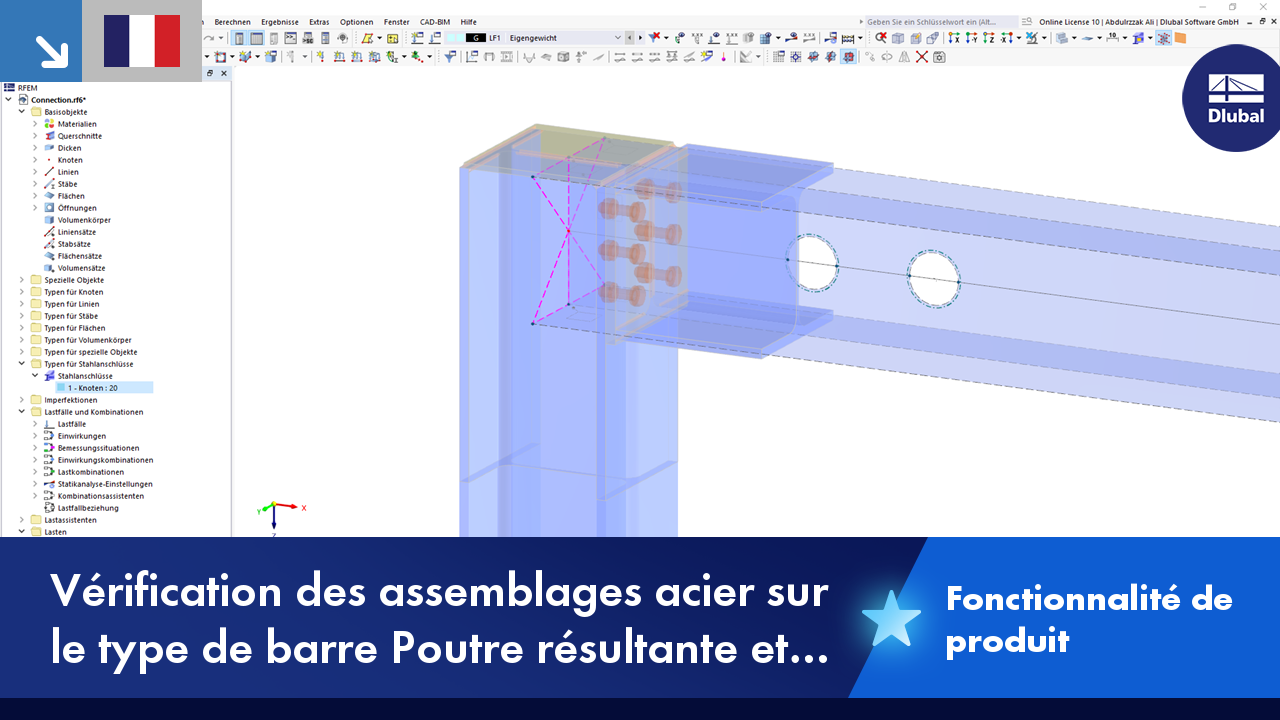 Le module complémentaire Assemblages acier permet l’analyse des assemblages sur la base d’un modèle EF. Les vérifications sont effectuées pour différents types d’assemblages avec des sections laminées et soudées. La saisie et l'évaluation des résultats sont entièrement intégrées à l’interface du logiciel de calcul de structures RFEM.