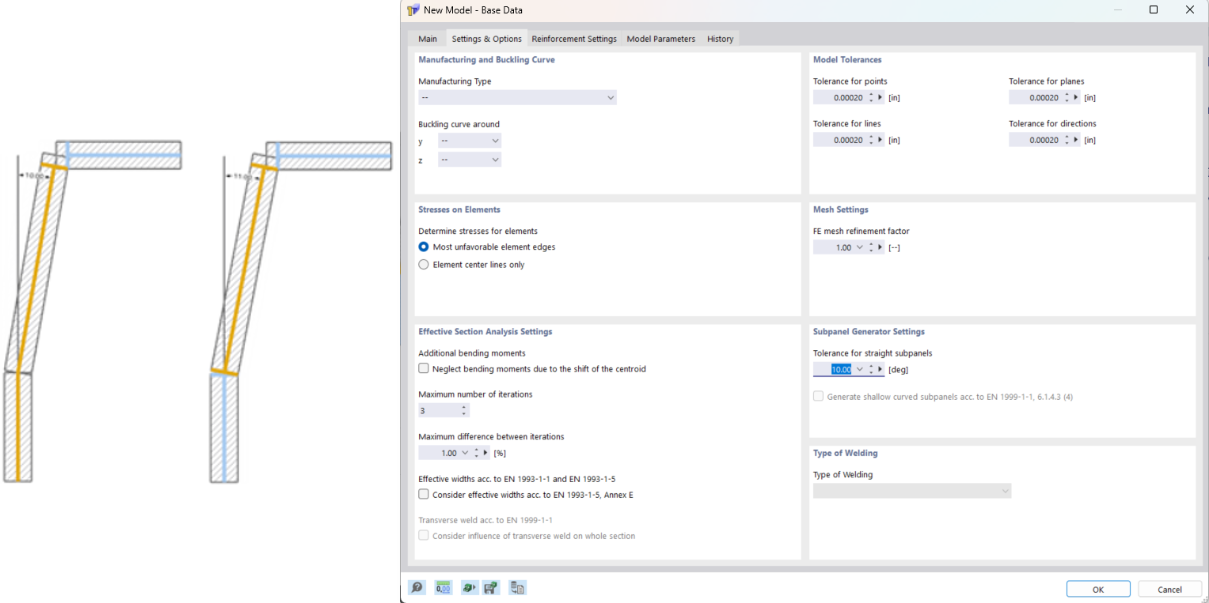 Cette case est accessible uniquement si vous avez sélectionné les normes EN 1993-1-1 et EN 1993-1-5 dans l’onglet Basis . L’EN 1993-1-5, Annexe E décrit une méthode alternative pour déterminer les sections efficaces pour les contraintes inférieures à la limite d’élasticité. Cochez cette case si vous souhaitez calculer la section efficace selon l’Annexe E.