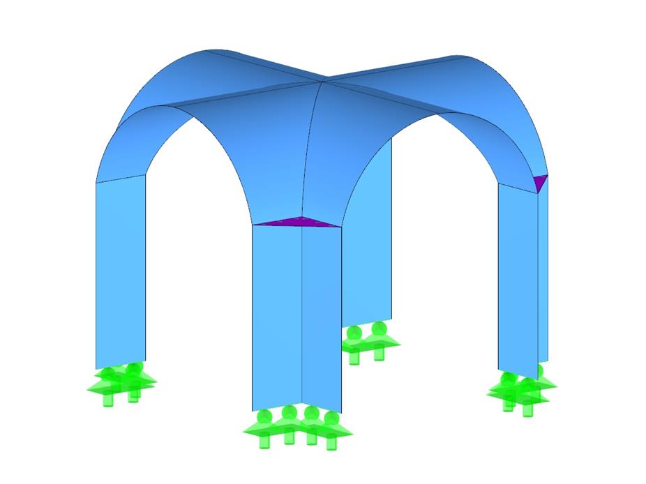 Le modèle présente une structure voûtée complexe en béton armé modélisée avec RFEM, une puissante application d’éléments finis pour le calcul précis des sollicitations.