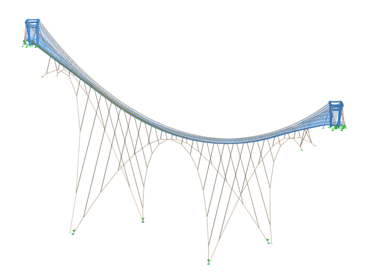 Un modèle 3D avec des éléments barres a été créé dans RFEM 5 afin de trouver la solution conceptuelle la plus appropriée pour la construction de la passerelle. Au total, 16 variantes de modèles de calcul ont été créées, qui se distinguaient par le nombre de câbles porteurs principaux, la flèche et la conception des câbles de sûreté.