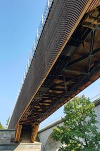 La structure existante a été préservée autant que possible. Seuls les composants structuraux trop abîmés pour une utilisation ultérieure ont été remplacés. Une protection contre les intempéries récemment développée, constituée de lamelles inclinées en mélèze, protège la structure et permet une vue non obstruée.