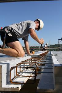 L'objectif était de concevoir un immeuble de bureaux entièrement durable. Les étages du nouveau bâtiment doivent être réalisés à l'aide d'une structure à ossature en bois lamellé-croisé. Des bandes de béton d'environ 30 cm de largeur ont été insérées afin d'assurer une résistance à la flexion et au cisaillement appropriée des connexions entre les lattes de plancher en bois massif. Les barres filetées vissées aux extrémités avant des panneaux en bois se chevauchent dans ces bandes. Les panneaux en bois lamellé-croisé à sept couches sont épais de 20 cm pour la toiture et de 24 cm pour le rez-de-chaussée et le premier étage. Les poteaux en bois lamellé-collé ont des dimensions de 30 x 30 cm et un espacement maximal d'environ 7 m.