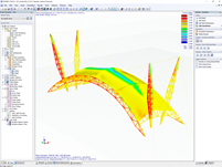 La solution intégrée de Dlubal Software a permis de réaliser la simulation de la soufflerie, la recherche de la forme des câbles, le calcul de la structure des barres en acier et l'analyse détaillée aux éléments finis des nœuds dans un seul logiciel.