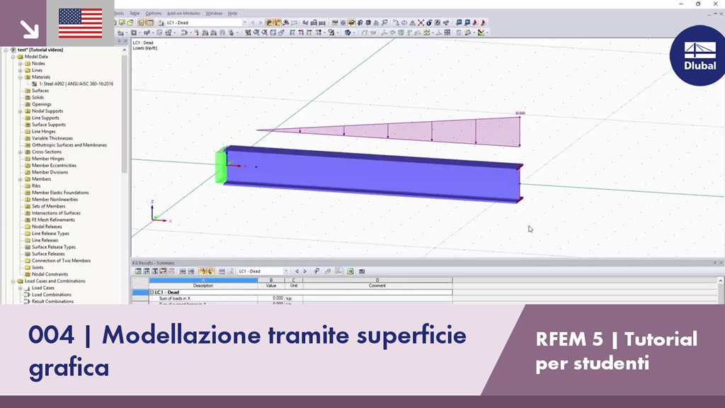 Questo quarto breve video tutorial mostra come modellare in RFEM solo con l'area grafica. Il modello diventa una trave semplicemente supportata e i risultati vengono calcolati e analizzati.