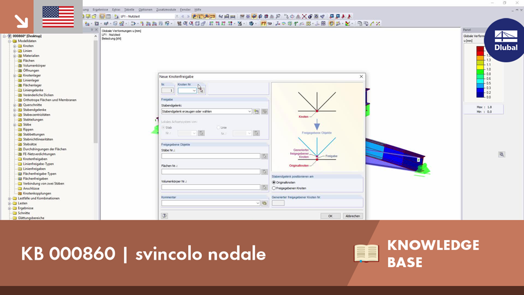 Di tanto in tanto, è necessario considerare in un modello che alcune travi giacciono solo liberamente l'una sull'altra senza avvitarsi o saldarsi. In RFEM 5, è possibile soddisfare facilmente questa condizione con un rilascio nodale. Per questo, è necessario definire un rilascio con la condizione di rilascio desiderata sul nodo pertinente nella finestra di dialogo Rilascio nodale. L'esempio mostrato nell'immagine corrisponde a questo con un rilascio della forza di taglio con una proprietà di essere fisso e Vz positivo. Con un carico di sollevamento segue il disaccoppiamento di entrambe le aste come risultato.