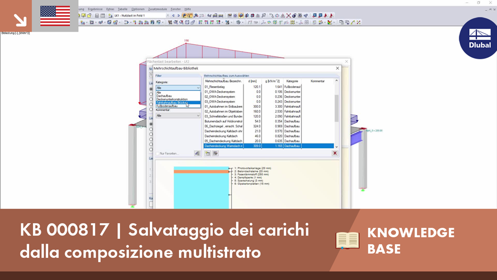 In RFEM e RSTAB, è possibile generare carichi dalla composizione multistrato. La libreria delle composizioni multistrato contiene già alcune strutture di solai e coperture. Tuttavia, questa libreria può essere modificata ed estesa a piacere. È inoltre possibile condividere le composizioni definite dall'utente con altri computer, evitando così la necessità di ricreare le composizioni di diversi utenti all'interno di un'azienda. Basta copiare il file "MultiLayer_User.db3" nella stessa directory per la libreria di composizioni multistrato sull'altro computer. È possibile verificarlo visualizzando le directory del database corrispondenti nella finestra di dialogo "Opzioni del programma".
