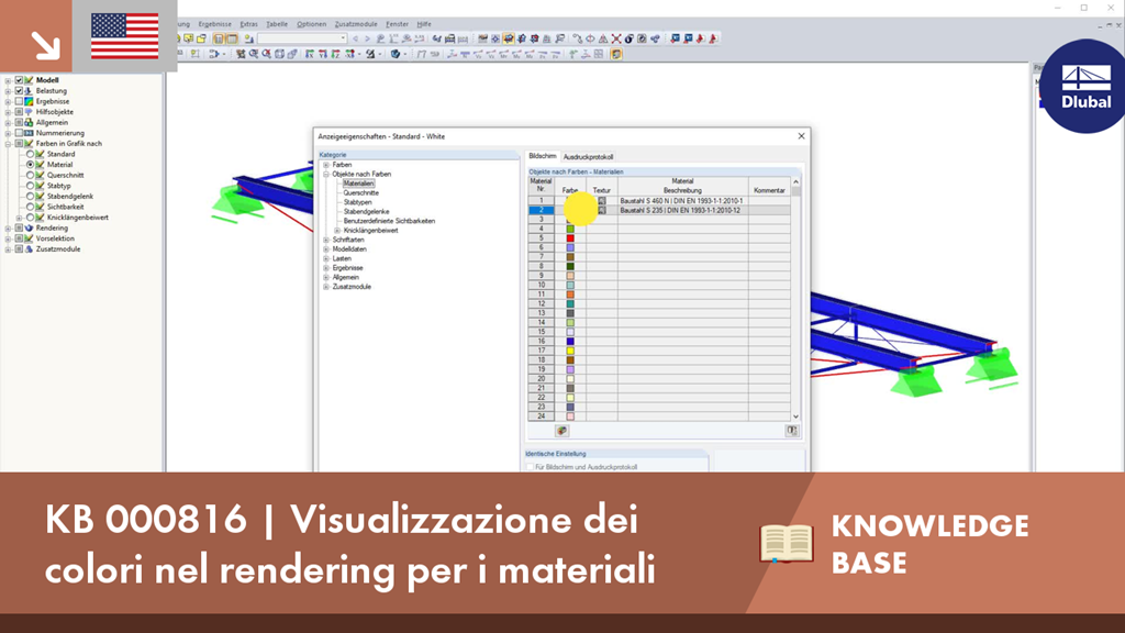 In RFEM e RSTAB, è possibile verificare o visualizzare visivamente i materiali utilizzati per le aste nei modelli wireframe e solidi.