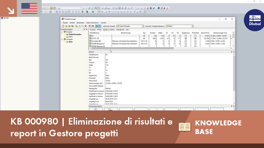 In rari casi, può accadere che un file RFEM o RSTAB non possa essere aperto. Questi file contengono principalmente risultati e dati di report. Al fine di eliminare i problemi causati dai dati dei risultati o dalle informazioni del report che non sono più leggibili, è possibile eliminare i dati nel gestore progetti senza aprire il progetto corrispondente. I dati strutturali, i carichi e le combinazioni definite rimangono invariati.