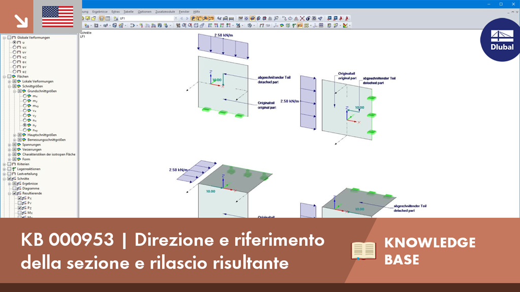 In RFEM, è possibile visualizzare la risultante di una sezione o svincolo. Questo articolo spiega quale parte dell'area della sezione è interessata. Il modo più semplice sarebbe riferire la risultante ad una faccia di taglio della superficie. Tuttavia, poiché una sezione può attraversare diverse superfici con diversi sistemi di coordinate locali, la determinazione mediante una faccia di taglio non è possibile.