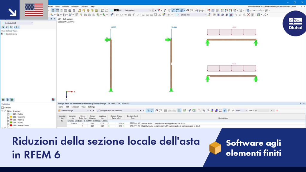Questo video mostra come assegnare riduzioni di sezione locali per le travi in legno. Per evitare intagli di modellazione con aste multiple e sezioni trasversali diverse, questa funzione consente di assegnare la riduzione della sezione direttamente su un'asta o su un set di aste. Per verificare la posizione e la geometria della tacca, viene visualizzata direttamente nella struttura. Nell'add-on Timber Design, queste riduzioni sono prese in considerazione.