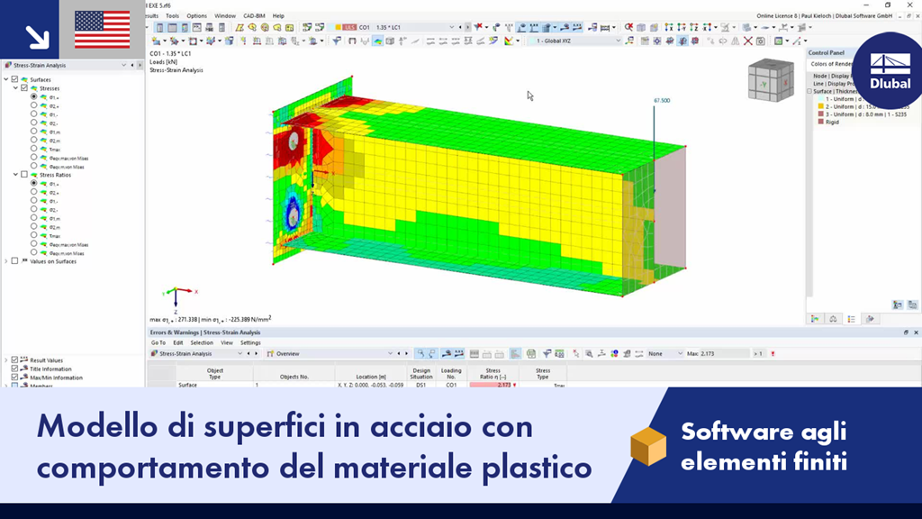 Per questo, l'add-on "Comportamento materiale non lineare" è stato attivato. Alle superfici è assegnato un modello di materiale plastico isotropo. I risultati dovrebbero essere spostati con l'opzione "Costante sugli elementi della mesh".