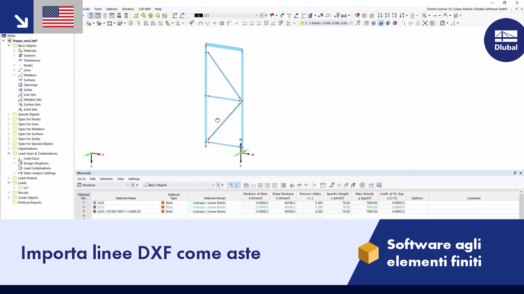 Questo video mostra l'importazione di un file DXF. La descrizione degli strati contiene il profilo e il nome del materiale. RFEM utilizza le informazioni durante l'importazione per convertire le linee in aste.