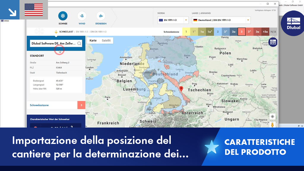 La posizione del cantiere può essere specificata su una mappa digitale. Oltre ai dati dell'indirizzo (incl. altitudine), vengono importate automaticamente la zona di carico da neve, la zona del vento e la zona sismica. Questi dati sono a loro volta utilizzati dalle creazioni guidate di carico.