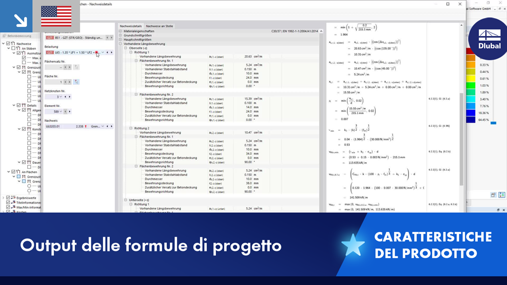 Per la progettazione di strutture in calcestruzzo armato, acciaio, legno, alluminio e così via, le formule di verifica utilizzate sono visualizzate in dettaglio (incluso un riferimento all'equazione utilizzata dalla norma). Queste formule di verifica possono anche essere incluse nella relazione di calcolo.