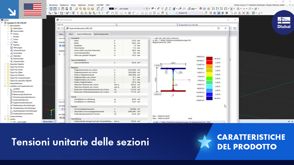 Per le sezioni dell'asta, è possibile visualizzare le tensioni unitarie (riferite a N = 1 kN, My = 1 kNm, ecc.) Per poter stimare la loro resistenza.