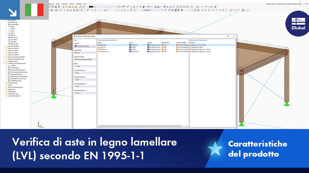 In RFEM ed RSTAB, è possibile progettare aste con il tipo di materiale "Legno microlamellare". Sono disponibili i seguenti produttori: