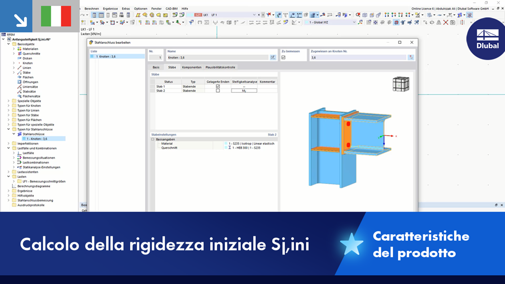 Nell'add-on Giunti acciaio, è possibile determinare la rigidezza iniziale Sj,ini secondo Eurocodice e AISC. Questo può essere fatto per le aste selezionate con riferimento alle forze interne N, My e Mz.