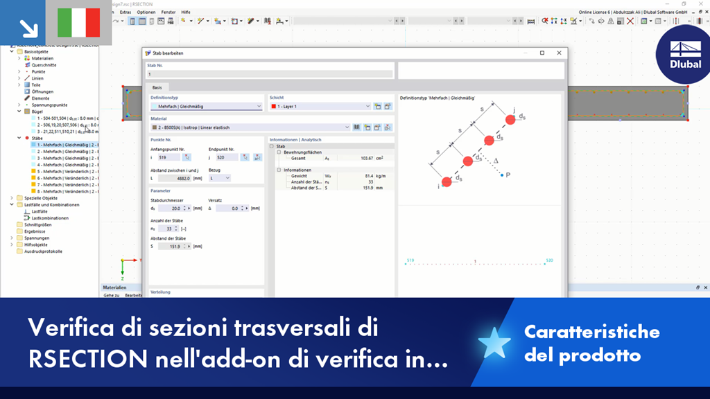 Nell'add-on Verifica calcestruzzo, è possibile verificare qualsiasi sezione trasversale di RSECTION. È possibile definire il copriferro, la forza di taglio e l'armatura longitudinale direttamente in RSECTION.