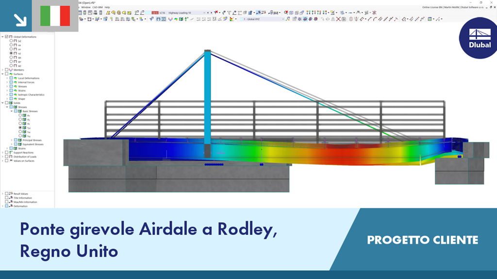 In RFEM, Matrix Consulting Engineers Ltd ha analizzato gli stati per ponte chiuso e ponte aperto. Nello stato chiuso, sono state impostate come azioni varie posizioni di carico per i veicoli e gli urti della nave.
