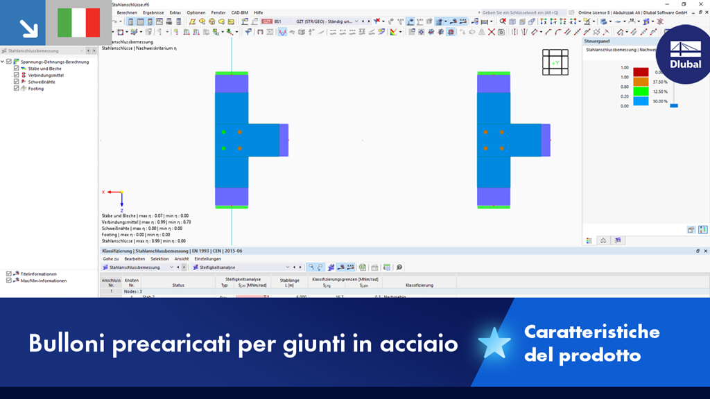 È possibile attivare facilmente la precompressione utilizzando la casella di controllo nei parametri del bullone. Ciò ha un impatto sull'analisi tensioni-deformazioni e sull'analisi di rigidezza.
