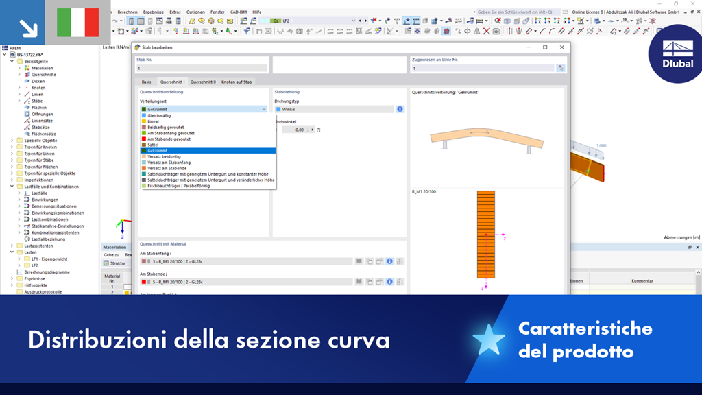 Vorresti calcolare travi curve, ad esempio, in legno lamellare incollato? A questo scopo, è possibile utilizzare varie distribuzioni di sezioni per aste: