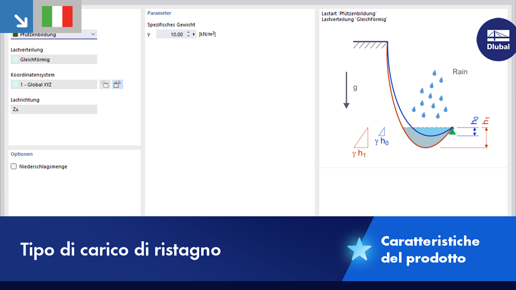 Questo processo numerico della pioggia analizza la geometria della superficie assegnata e determina la quantità di pioggia drenata e accumulata in sacche d'acqua sulla superficie. La dimensione dell'accumulo d'acqua risulta quindi in un carico verticale corrispondente per l'analisi strutturale.