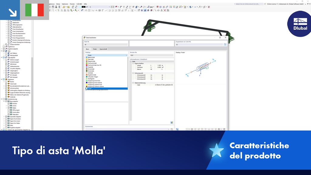 Il tipo di asta "Molla" viene utilizzato per simulare le proprietà lineari e non lineari della molla tramite un oggetto lineare. Questa funzione di input consente di modellare le specifiche di rigidezza nell'unità di forza/spostamento.