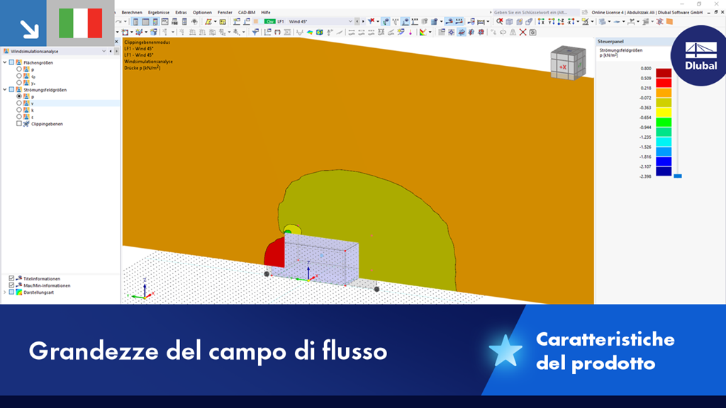 In RFEM e RSTAB, è possibile visualizzare le quantità del campo di flusso di pressione, velocità, energia cinetica di turbolenza e tasso di dissipazione della turbolenza per la simulazione del vento.