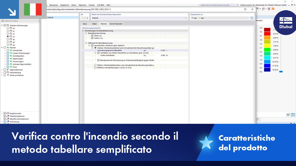 Nell'add-on Verifica calcestruzzo per RFEM 6, è possibile eseguire la verifica contro l'incendio di solai e pareti in cemento armato secondo il metodo tabellare semplificato (EN 1992-1-2, Sezione 5.4.2 e Tabelle 5.8 e 5.9).