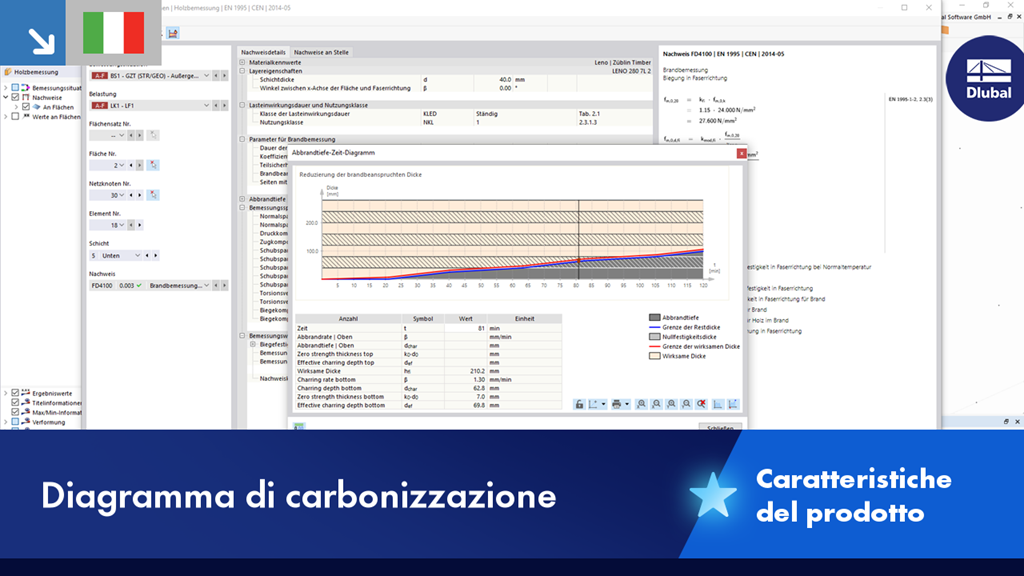 Per la verifica della resistenza al fuoco delle superfici in legno, è possibile visualizzare un diagramma di carbonizzazione a seconda del tempo di esposizione al fuoco.