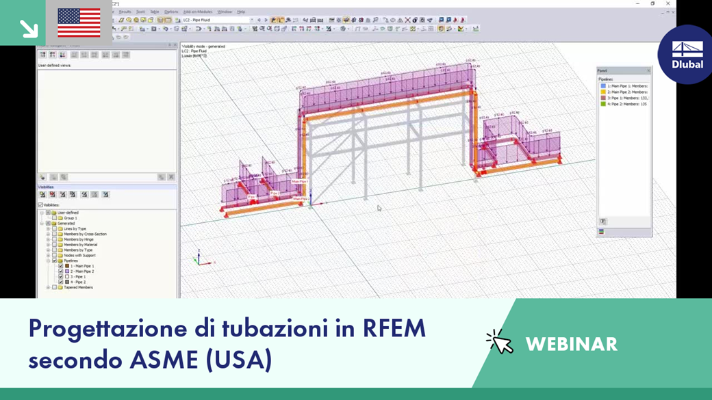 - Modellazione del sistema di tubazioni e della struttura di supporto in RFEM con estensione del modulo RF-PIPING