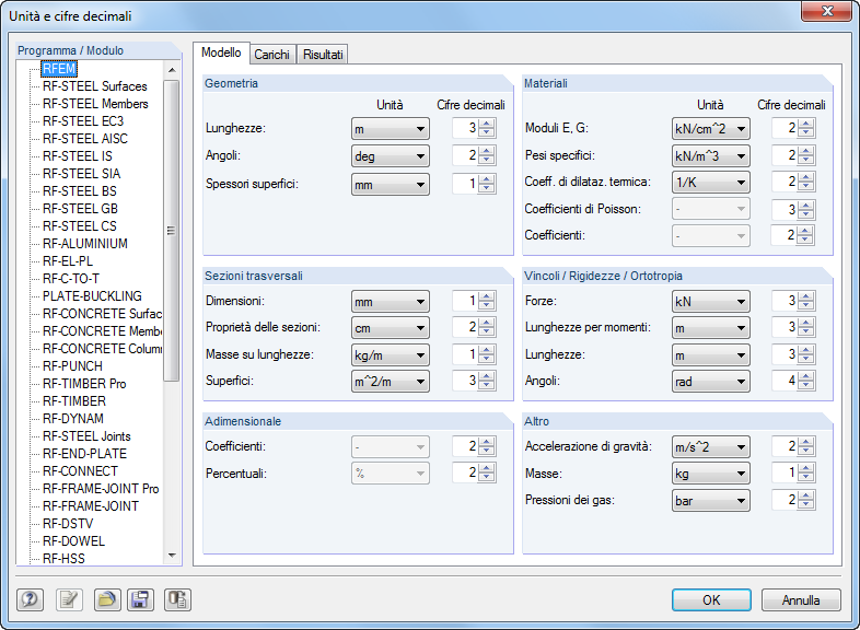 In RFEM/RSTAB ed in tutti i moduli aggiuntivi, le unità dei dati di input, dei carichi e dei risultati vengono specificati in un'unica finestra di dialogo generale.