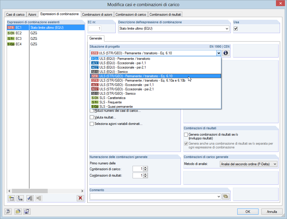Per la combinazione di azioni allo stato limite ultimo e di esercizio, è possibile selezionare varie situazioni di progetto secondo la norma (ad esempio SLU (STR/GEO) - permanente/transitorio, SLS - quasi -permanente e altre).