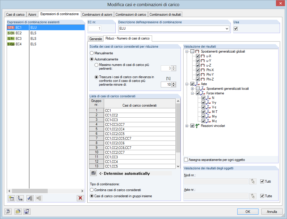 La seconda possibilità permette al programma di valutare automaticamente le combinazioni di risultati generati temporaneamente o definite dall'utente. Poi saranno create solo le combinazioni di carico determinanti.