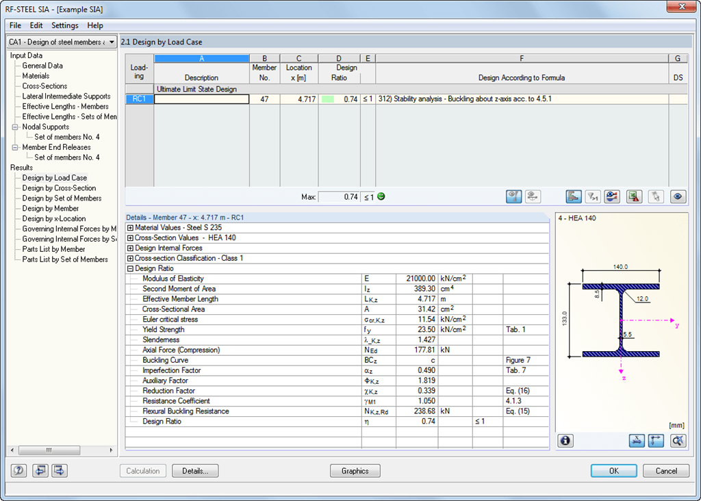 Per ragioni di valutazione dei risultati, sono disponibili tabelle dei risultati chiaramente organizzate. La prima finestra dei risultati mostra il massimo rapporto di progetto e l'analisi corrispondente per ogni caso, gruppo o combinazione di carico calcolata.