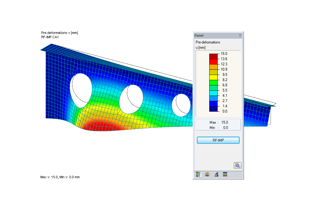 Quando si genera una mesh EF predeformata in RFEM, i dati di spostamento di ogni singolo nodo vengono salvati in background. Questo può essere usato per il calcolo delle combinazioni di carico in RFEM. Al fine di verificare i dati generati, la pre-deformazione viene visualizzata in tabelle e graficamente.