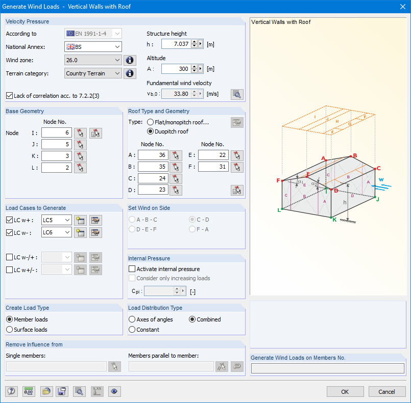 I carichi del vento possono essere generati automaticamente come carichi delle aste o carichi superficiali sui seguenti componenti strutturali (opzionale con pressione interna per edifici aperti):