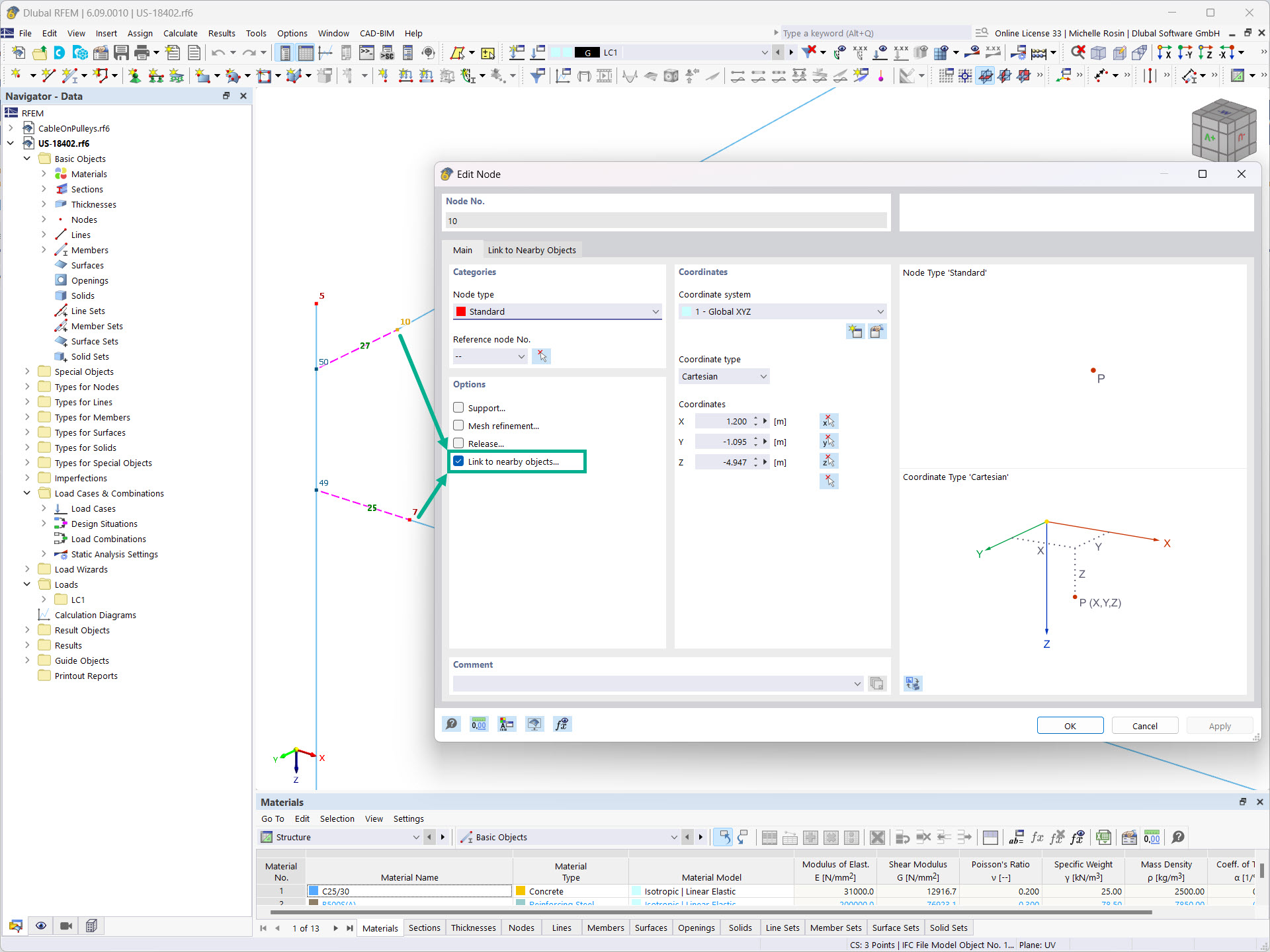 Se si attiva l'opzione per i nodi 'Collegamento a oggetti vicini...', in RFEM o RSTAB vengono cercati automaticamente oggetti adiacenti. A questi aste, nodi o superfici viene quindi creata una connessione sotto forma di un'asta rigida.