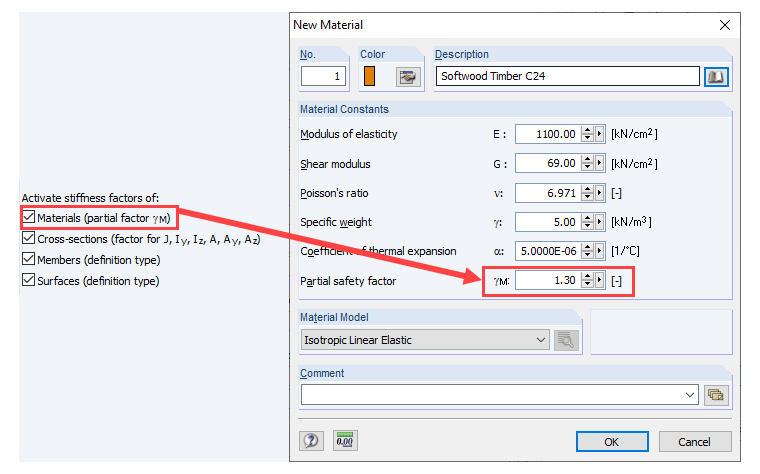 Die erste Option "Materialien" ist standardmäßig nur für Lastkombinationen aktiviert (siehe Bild 02), da hierfür die <nobr>Theorie II. Ordnung</nobr> voreingestellt ist. Ist die Funktion aktiviert, so wird die Steifigkeit aller Elemente durch den Teilsicherheitsbeiwert des Materials abgemindert (siehe Bild 03). Dies ist vor allem im Holzbau in Europa von Bedeutung. Wurde die automatische Lastkombination für die Norm EN 1990 + EN 1995, SIA 260 + SIA 265 oder DIN 1055-100 + DIN 18008 gewählt, so resultieren abweichende Standardeinstellungen. Ist der Teilsicherheitsbeiwert des Materials mit 1,0 definiert, spielt es keine Rolle, ob die Funktion aktiviert ist oder nicht.
