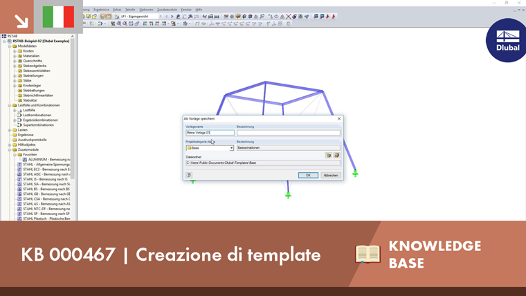 In RFEM 5 e RSTAB 8, è possibile salvare una struttura in un progetto modello separato utilizzando "File" -> "Salva come modello". Può essere aperto direttamente nel Project Manager, consentendo così un facile accesso ai template salvati.