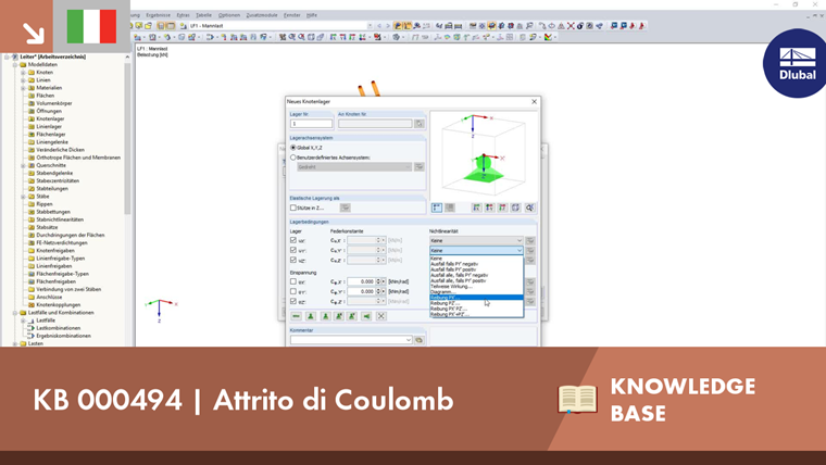Poiché la resistenza alla forza di taglio tra due elementi ha un'influenza sul gioco di forze nell'intero modello, RFEM e RSTAB consentono un accoppiamento ad attrito statico alle definizioni di vincolo, cerniera e rilascio. Questo approccio simula l'attrito utilizzando un processo di calcolo iterativo automatizzato che verifica le condizioni di attrito statico dopo ogni iterazione e applica le misure appropriate per mantenere l'equilibrio. La funzione è stata progettata in modo tale che l'utente specifichi direttamente i gradi di libertà di accoppiamento nella direzione in cui scorre la forza di attrito e dalla direzione in cui proviene la forza di compressione.