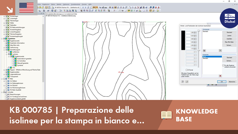 Standardmäßig werden die Ergebnisse mittels elf Isolinien zwischen den beiden Extremwerten Min/Max farbig dargestellt. Im Dialog "Wert- und Farbskalen der Isolinien bearbeiten" können die Isolinienanzahl und -farbe editiert werden. Für den Schwarz-Weiß-Ausdruck sollten die Farben der Isolinien auf schwarz umgestellt werden. Um nun die Wertigkeit der Isolinien zu erkennen, müssen die einzelnen Isolinien mit Ergebniswerten versehen werden. Hierfür stehen in RFEM drei Möglichkeiten zur Verfügung, welche über den Zeigen-Navigator steuerbar sind.