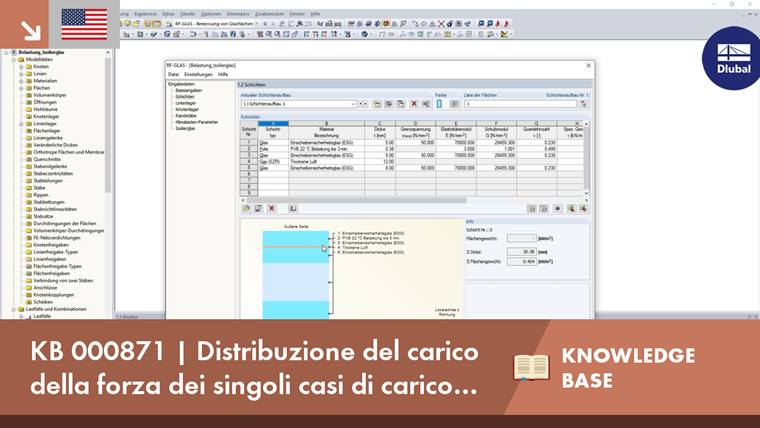 In questo caso, il carico del vento deve agire sullo strato esterno e il carico della protezione anticaduta deve agire sullo strato interno. In RF-GLASS, è possibile unire i singoli casi di carico in una combinazione di carico (CO) e contemporaneamente assegnare i casi di carico contenuti separatamente ai diversi lati del vetro (Tabella 1.7) ed eseguire il calcolo.