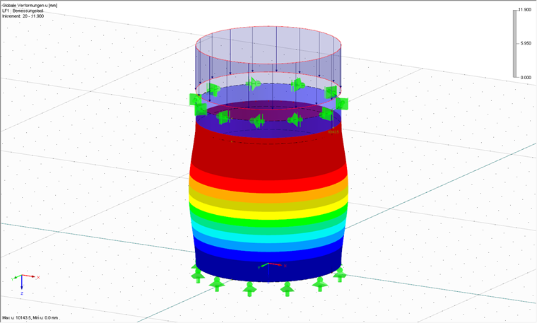 Dopo aver inserito il modello e il carico e aver selezionato le impostazioni della mesh EF adatte, il calcolo con RFEM può iniziare. Innanzitutto, viene eseguita l'analisi non lineare del materiale. Lo scopo di questa analisi è la resistenza plastica di riferimento (cioè il coefficiente di carico critico al quale l'intero guscio si rompe plasticamente). Il modulo aggiuntivo RF-MAT NL è idealmente utilizzato, poiché in RFEM sono disponibili solo le proprietà non lineari del materiale. In alternativa, è possibile eseguire un calcolo elastico lineare; allora la resistenza di riferimento plastica può essere calcolata approssimativamente utilizzando la formula (8.24) da [3]. La Figura 02 mostra il sistema deformato dopo aver raggiunto la resistenza di riferimento plastica rRpl = 11,90.